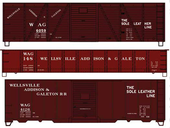 ACC | 8160 | 40' AAR SINGLE DOOR BOX CAR, 41' AAR STEEL GONDOLA, 40' WOODEN 6 PANEL OUTSIDE BRACED BOX CAR (KIT, 1ea; 3/pkg) | WAG - WELLSVILLE ADDISON & GALETON (brown, white lettering) | 10000円 | 161円/$ |