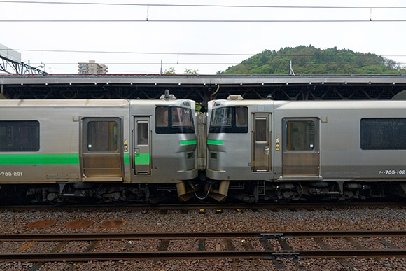 二日目の晩も札幌で,今夜はオリコOBの呑み会だ. 札幌に向かうため小樽駅に行ったらレアな車両,735系電車がやって来ました. 左がステンレスボディの733系で右がアルミボディの735系です.