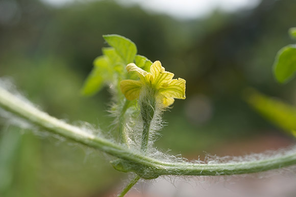 ちょっと早いけど,もう答です. スイカの花でした. スイカの花は雌花と雄花があり,花びらの下がプックリ膨らんでいるのが雌花で,こちらがスイカになります. 子供の頃からウリボウみたいな模様です ↓ |