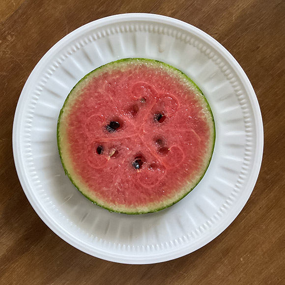 見た目スイカになりました. さあ出来たかなと思って収穫したら,中は白くて未完成でした. でも甘くて不思議な感じ ↓ |