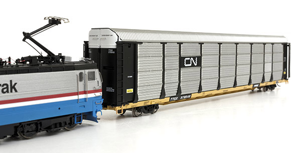 カナディアンナショナルスキムは黒基調で,黄色のTTX台車とのコントラストがさわやかだ. 連結面上部の白い部分は東部の小さい車両限界からはみ出すことを示すと先に述べたけど,電気機関車との連結が成り立たないのがお分かりいただけよう.