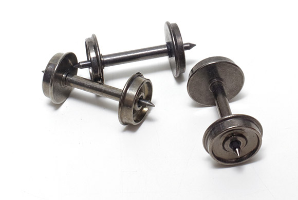 | インターマウンテンの車輪は,Kadeeやプロト2000製品とは違い,削り出しですから踏面が平滑で転がる時の音がゴロゴロせずにスムーズです. インターマウンテンの車輪はほかにも魅力があります. 軸端の尖り角度が小さくその上軸径が細いので,台車側の軸穴とのスキマが広くとれ,ゴミが入っても留まりにくいことです. 軸箱にゴミが溜まると,回転抵抗が増えますが,その心配がほとんどないということです. 踏面幅が狭くてスケールに近いものもありますが,レール幅の管理がしっかりしてないと不具合を起します. | ||