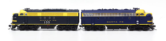 | インターマウンテンのFTAとFTBは年初(でしたっけ?)にも登場させましたが,中途半端な説明からいつくかご質問を頂戴しましたので,普通のF形ディーゼルとともにもう一度ご紹介です. 後に大ブレイクするドッグノーズ顔ディーゼル機関車最初期となったFTAとFTBが誕生したのは,ディーゼル機関車黎明期から少し経過した1930年代後半です. しかしこの時期のディーゼル機関車の出力は1000馬力少々と蒸気機関車に遠くおよばず,メインラインで使用するには最低でも重連でした. 左がFTAで右がF7ですが,FTAとF2〜F9は,ボディの長さが違います. |
