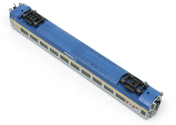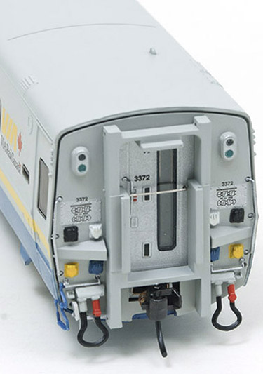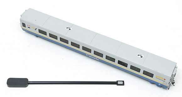 黒い道具は一端に磁石が着いた棒で,屋根の内側に仕掛けられた磁石で反応するスイッチを操作し,室内灯の点滅をさせます. 北米では行き先別に乗客を案内し,乗客が皆無となる区間では室内灯を消灯しますが,これを再現するためのものです. 車端部のディテールも不足はないですね. アムトラックでは常に,VIAでもほとんどの列車が機関車は片側だけですから,フルディテールのエンドを楽しめます. |