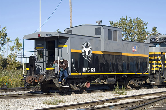 シカゴで2007年に撮影したこの写真の時代には,メインラインの列車は極寒冷地を運行するなど特殊事情を抱える路線以外では,カブースの連結は廃止されていた. このカブースは,大都市に点在する鉄道ヤード間を移動する貨車と組成されるトランスファーカブースと呼ばれている業務用車両で,通常機関車の次に連結され,作業要員や道具の輸送目的で使われている.