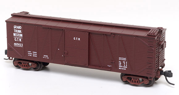 デポでは赤がNスケールのシンボル,だからこの木造ホックスカーはNスケールです. 木造のボックスカーです. 柱が外に出てますからアウトサイド(外)ブレイスト(支柱)ボックスカーと言います. 支柱の外にも木の板を貼り付けて支柱が隠れた木造ボックスカーは,ダブルシェストボックスカーといます.