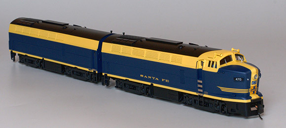 同じくボールドウインですが2軸はサメ顔です. アメリカの機関車は制御方式を合わせていますがボールドウインだけは別方式で,違うメーカーの先頭機関車からのリモコン運転ができません. シャークのサンタフェ鉄道があったらいいなということで,このカラーリングは存在しません. 言い忘れましたが,先のUPカラーのベビーフェイスも,実在しません.