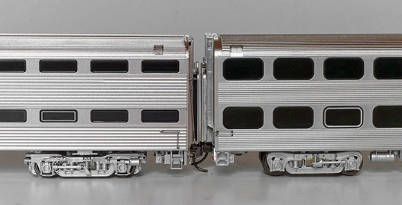 左がラピードトレインズ/Budd製,右がアトラス/日本車輌製です. 実車ボディはステンレス鋼の組成相違から色合いが微妙に違います. 川重と東急車輛/JTRECみたいなものです.