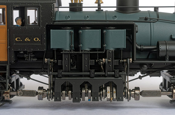 片側に大きな蒸気シリンダを備え,機関車,テンダー計4基の台車を駆動します.