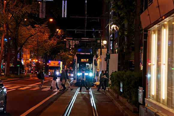 市電が復活した西4丁目〜すすきの間は歩道にレールを寄せてあります. 狸小路にも電停が設けられ,乗降客が多いこの区間は道路中央の安全地帯より好ましいですが,歩道間際なので徐行するため歩いた方が早いです.