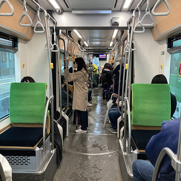 連接車の室内です. 3車体前後の車両が4輪で,中間の車両は前後の車両から吊されています. 床が低くて車軸が貫通しておらず,そのためか直線でも左右の揺れが多いように感じますが,狭い電停でスムーズに昇降できるのすとても良いことです.