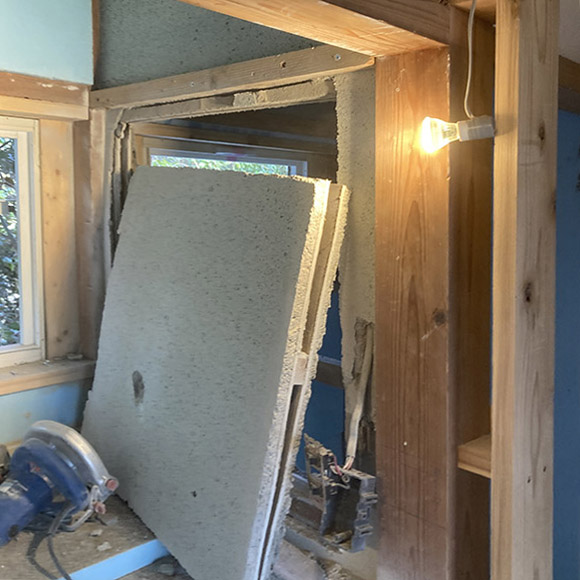アレコレ次々実現すると,予期しなかった注文が飛び込みます. 壁の厚みを利用したキャビネットを作ることになりました. 電線探知器で電線の位置を確認し,丸鋸で切りことにしました ↓ |