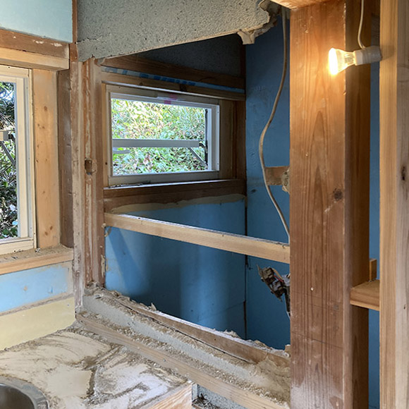 裏面のトイレの壁まで切ってしまったので,壁とキャビネットと一体で作ることにしました. その方が壁の厚さだけキャビネットの奥行きが増えます ↓ |