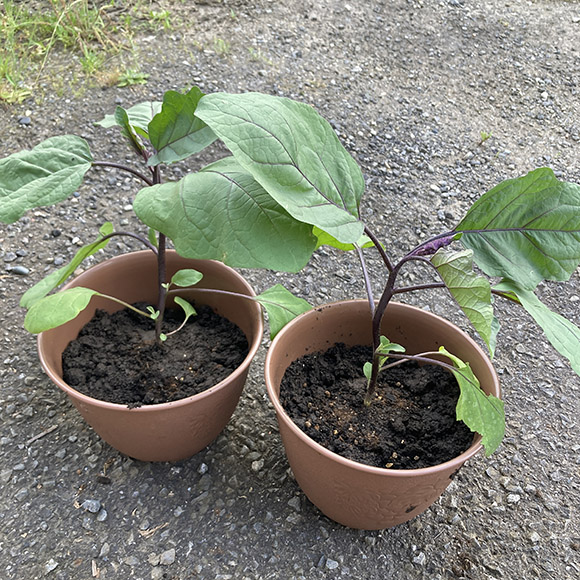ナスをつかって実験しました. タマゴの殻と酢を混ぜて3日放置した液体が,栄養と防虫効果があるとTV番組でやっていたので試してやろうと言うわけです. しかしそのうちどちらだかわからなくなりましたが,どちらも花が落ちて実ることはありませんでした. 同時に購入して地植えした苗は,ちゃんと実を結びましたから,鉢の中で根を張れなかったのでしょう ↓ |