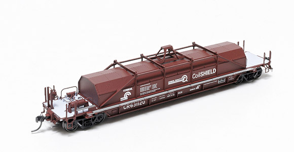 以前話題にしたコイル鉄板運搬カバー付フラットカーのコンレイルバージョン. 独特のスタイルが,普通の貨物列車に異彩を放つ.