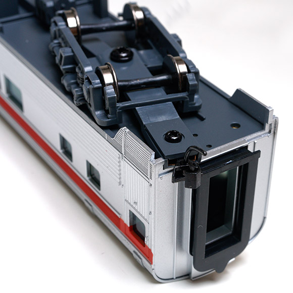 これも好き嫌い別れるところですね. このような方式だと連結器周囲のディテール取り付けは困難です. ところでウオルサーズの客車に室内照明を入れる際8輪集電するので,各輪軸とも左右車輪が電気的に絶縁されてます. ですからインターマウンテンのメタル車輪の取り付けはngです.