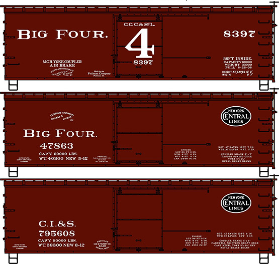 | HO | ACC | 1809 | 36' STEEL ROOF DOUBLE SHEATHED WOODEN BOX CAR (WOOD END; KIT; 3/pkg) | BIG FOUR; NYC / CCC&StL - CLEVELAND CINCINNATI CHICAGO & St. LOUIS, CI&S - CHICAGO INDIANA & SOUTHERN | $64.98 |