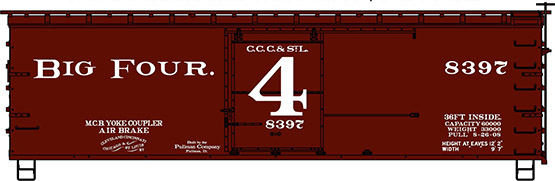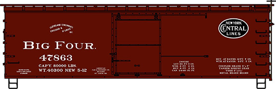 | HO | ACC | 18091 | 36' STEEL ROOF DOUBLE SHEATHED WOODEN BOX CAR (WOOD END; KIT) | BIG FOUR; NYC / CCC&StL - CLEVELAND CINCINNATI CHICAGO & St. LOUIS (brown, black Oval herald, white lettering) | $21.98 |