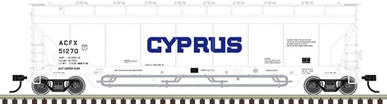 | N | ATL | 50007339 | ACF 4 BAY PRESSUREAIDE CENTER FLOW COVERED HOPPER | ACFX - AMERICAN CAR & FOUNDRY / CYPRUS ACFX 51270 (white, blue logo, black lettering) | $42.95 |