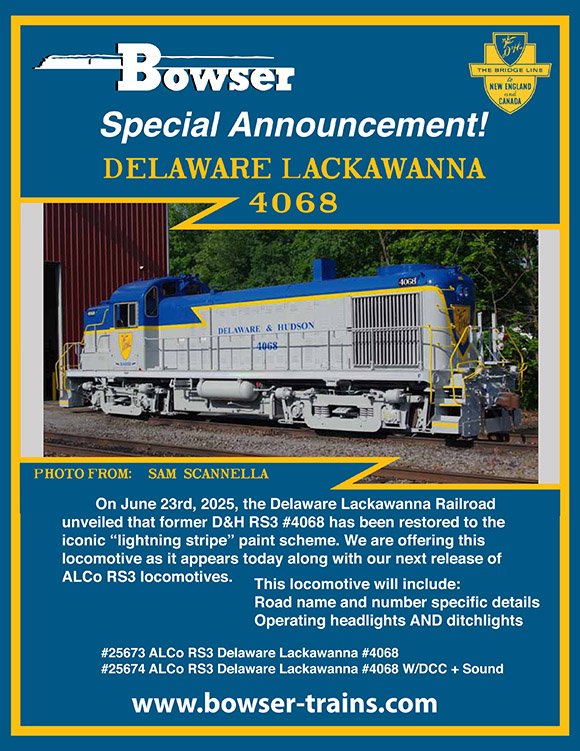 | HO | BOW | 25674 | ALCO RS3 (ESU LokSound) | D&H - DELAWARE & HUDSON 4068 (2025 RESTORED; gray, blue, yellow Lightning stripes & herald) | $339.95 |