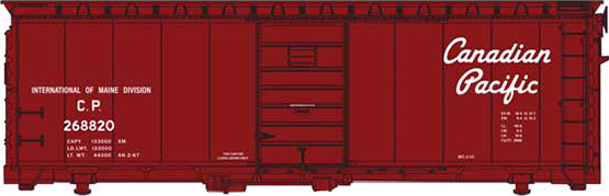| HO | WAL | 910-45501 | 40' PS1 SINGLE DOOR BOX CAR | CP - CANADIAN PACIFIC 268820 (SCRIPT; brown, white lettering) | $38.98 |